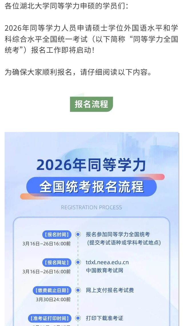 湖北大学2026年同等学力全国统考报名指南